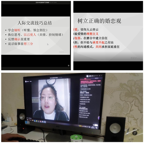 为缓解疫情期间心理压力,引导同学积极调整学习心态,4月18日晚,信息学院组织广大师生开展线上心理辅导讲座。主讲人为国家二级心理咨询师、学工办辅导员胡迪老师。共有269名师生加入课程直播间。讲座主要从“疫情期间如何调试心理、如何应对人际关系困惑和如何树立,正确的婚恋观”三个方面进行。同学们纷纷通过课程直播间留言提问等方式交流内心想法、疏导内心烦闷,为返校学习调整到了最佳心理状态。