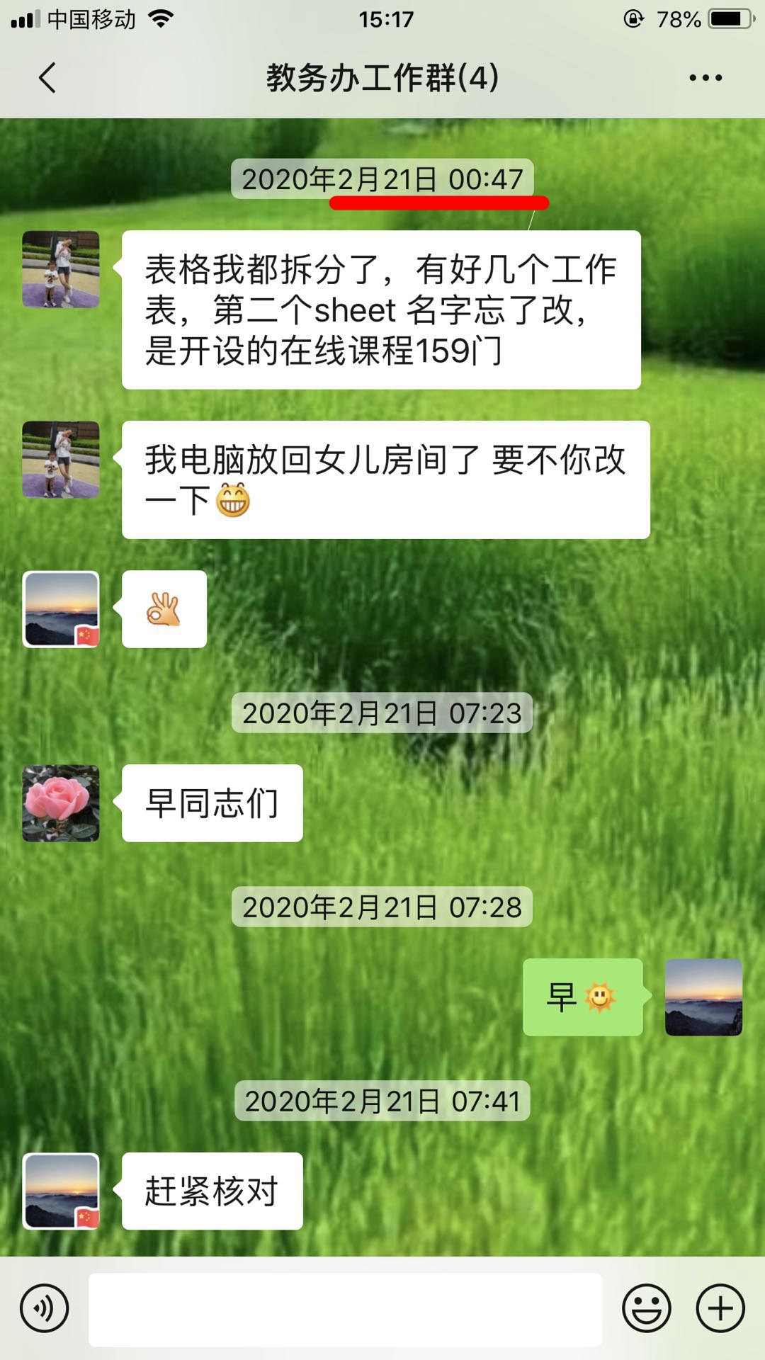 学院共有5位教务一线工作人员。包括有教务办教务人员和学科办与研究生、高技能课程相关的工作人员,她们中有奋战在抗击新冠病毒肺炎疫情的最前线的医生家属、有二胎妈妈、还有处在哺乳期的妈妈、还有身体不好不能熬夜的工作人员。。。这五位工作人员中有四位是党员,她们亮明身份、克服困难、争当共战“疫”线的“排头兵”,以坚强的决心,确保了学院教学工作有序开展。