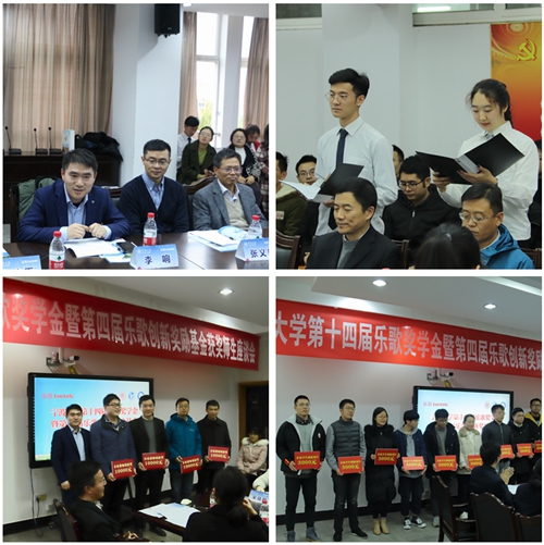 两个学院分别就本年度的评奖工作做了详细介绍,本年度共有100余人获得了乐歌奖,乐歌公司总经理李响及学院领导为获奖同学颁发证书,学生代表创作了一首感恩朗诵以表达对乐歌公司的感激之情。座谈环节,获奖教师代表、学生代表分别从自身学习生活经历、获奖感受、乐歌奖对自己学业生活的影响以及对乐歌公司的感谢几方面做了发言。乐歌公司总经理李响在听到同学老师发言后有感而发,也介绍了自己的学习成长经历,以自身的成长经验引导和教育在座获奖同学要找准目标、勤于奋斗、厚积薄发。
