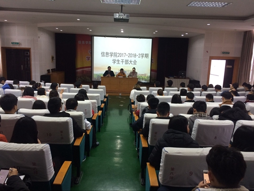 3月5日中午,信息学院在信息楼五楼报告厅召开了本学期学生干部大会,学院院长助理严水英、学工办主任孙文静、团委书记汪小静以及各学生组织主要负责人,各班班干部100余人参与了会议。 本次会议是新学期的第一次大会,首先就开学初的安全稳定、诚信补考、寝室卫生大扫除等相关工作了做了布置,随后也对本学期的学生工作思路和重点做了沟通与传达,为本学期各项工作的有序开展奠定了基础。