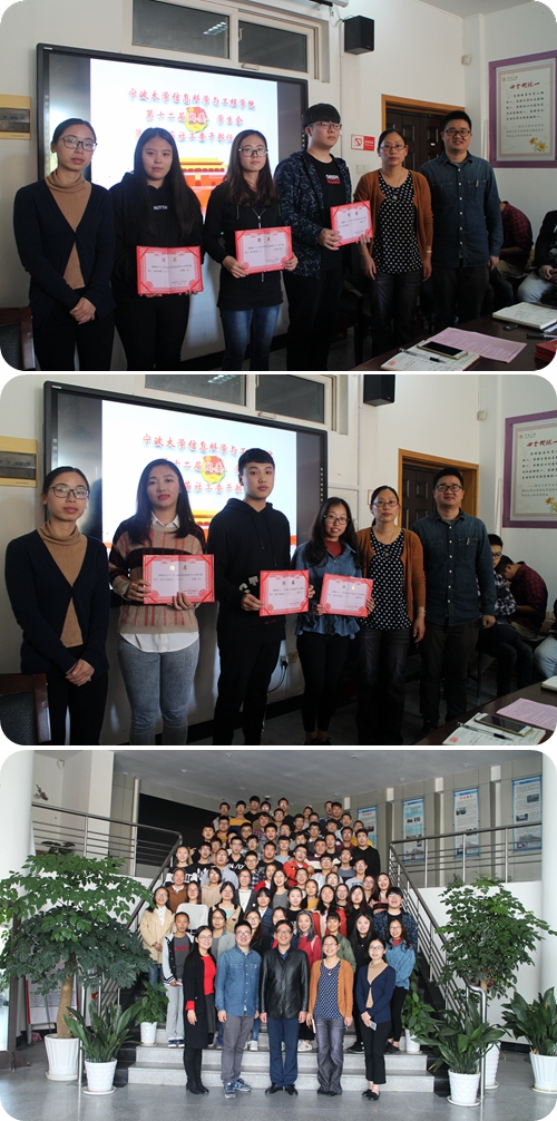 信息学院第十二届团学社任命大会在信息学院113召开。会议到场人员有:信息学院党委副书记屠春飞书记、学工办主任孙文静老师、团委书记汪小静老师、团委副书记宋佳敏老师以及第十二届全体团学社骨干。