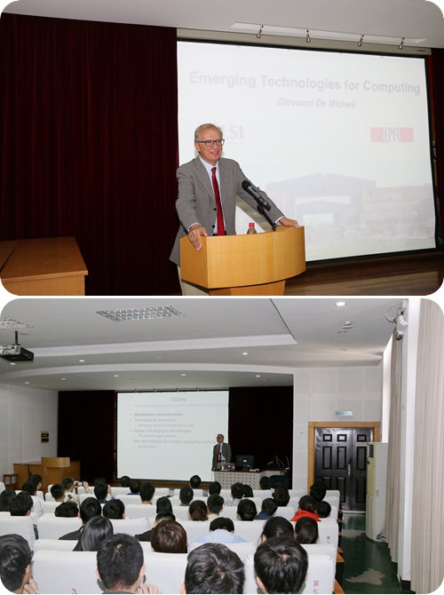 10月27日,受我校信息学院院长夏银水研究员的邀请,瑞士洛桑联邦理工学院Giovanni De Micheli教授来访,并在信息楼5楼报告厅做“Emerging Technologies in Computing”学术报告,这是信息学院开设“永新”名家讲坛以来的首场讲座。共吸引了信息学院师生160余人参加此次讲座,并在会后进行了深入交流。De Micheli教授从新型计算器件,新型计算范型、设计工具和综合方法等诸多方面讨论了新兴计算技术的发展和未来趋势。主要包括基于Majority逻辑的综合方法以及重要应用,基于阻性随机存储器(RRAM)的FPGA设计,及用于健康监测的生物传感器开发等内容。