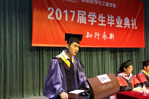 在学院表彰了2016、2017年度的“最美信息人”获奖者后,高尚超、张慧慧同学分别代表研究生、本科毕业生发言,感谢母校栽培之情,师长教育之恩。教师代表郭立君老师上台发言祝福毕业生们放飞梦想。