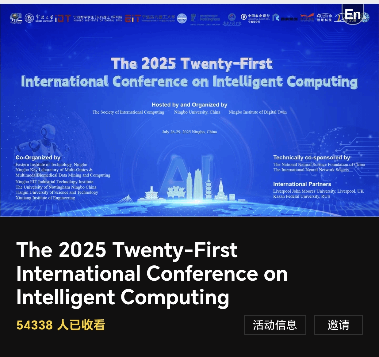 承办,宁波数字孪生(东方理工)研究院联合承办,宁波东方理工大学、宁波市多组学多模态数据挖掘与计算重点实验室、宁波东方理工产业技术研究院、宁波诺丁汉大学、天津科技大学、新疆工程学院协办。本次会议以“高级智能计算方法和应用”为主题,受到了宁波市科学技术协会甬江科创区重点平台高水平学术交流与创新活动专项支持,并获得了国家自然科学基金委和国际神经网络学会的技术指导。