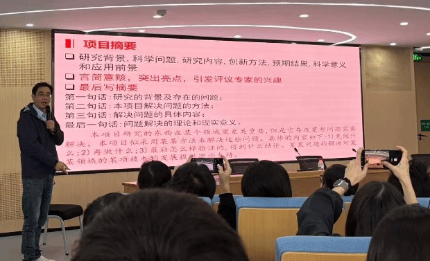 专题辅导环节,肖俊教授以《国家自然科学基金申请经验谈》为题,凭借其多年担任国家自然科学基金评审专家的经验,从申报选题的精准定位、科学问题的凝练提升、立项依据的逻辑构建、研究内容的系统设计到项目摘要的凝练表达等关键层面,作了系统而深入的阐释。他结合评审实践中的典型实例,精准剖析了申报书撰写的常见问题与核心难点,并提出针对性改进策略,为与会教师提供了兼具学术高度与实践操作性的专业指导,现场反响热烈。