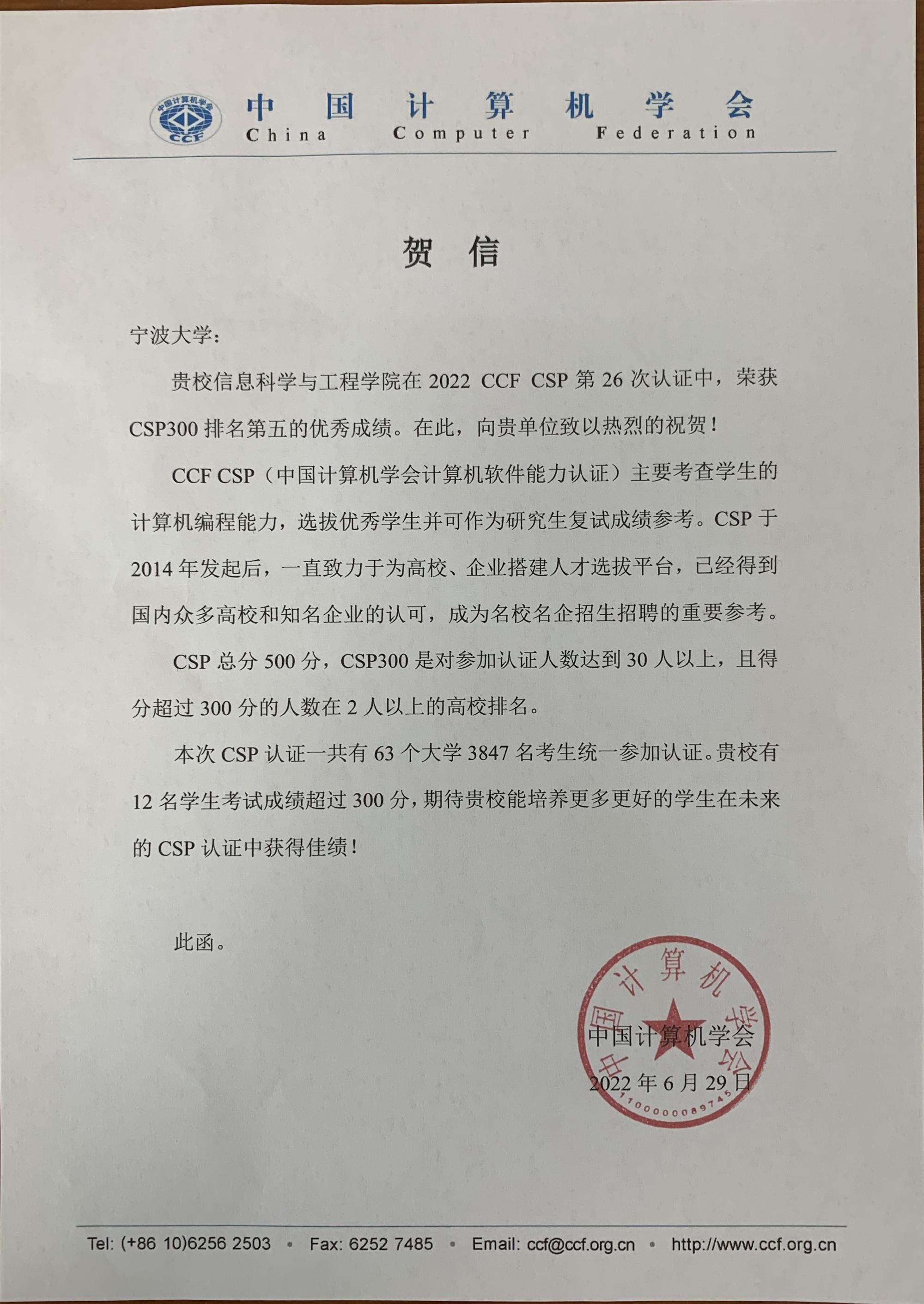 在2022 CCFCSP第26次认证中,荣获CSP300排名第五的优秀成绩。CSP总分500分,CSP300是对参加认证人数达到30人以上,且得分超过 300分的人数在2人以上的高校排名。本次CSP认证一共有63个大学3847名考生统一参加认证。我校有12名学生考试成绩超过300分。