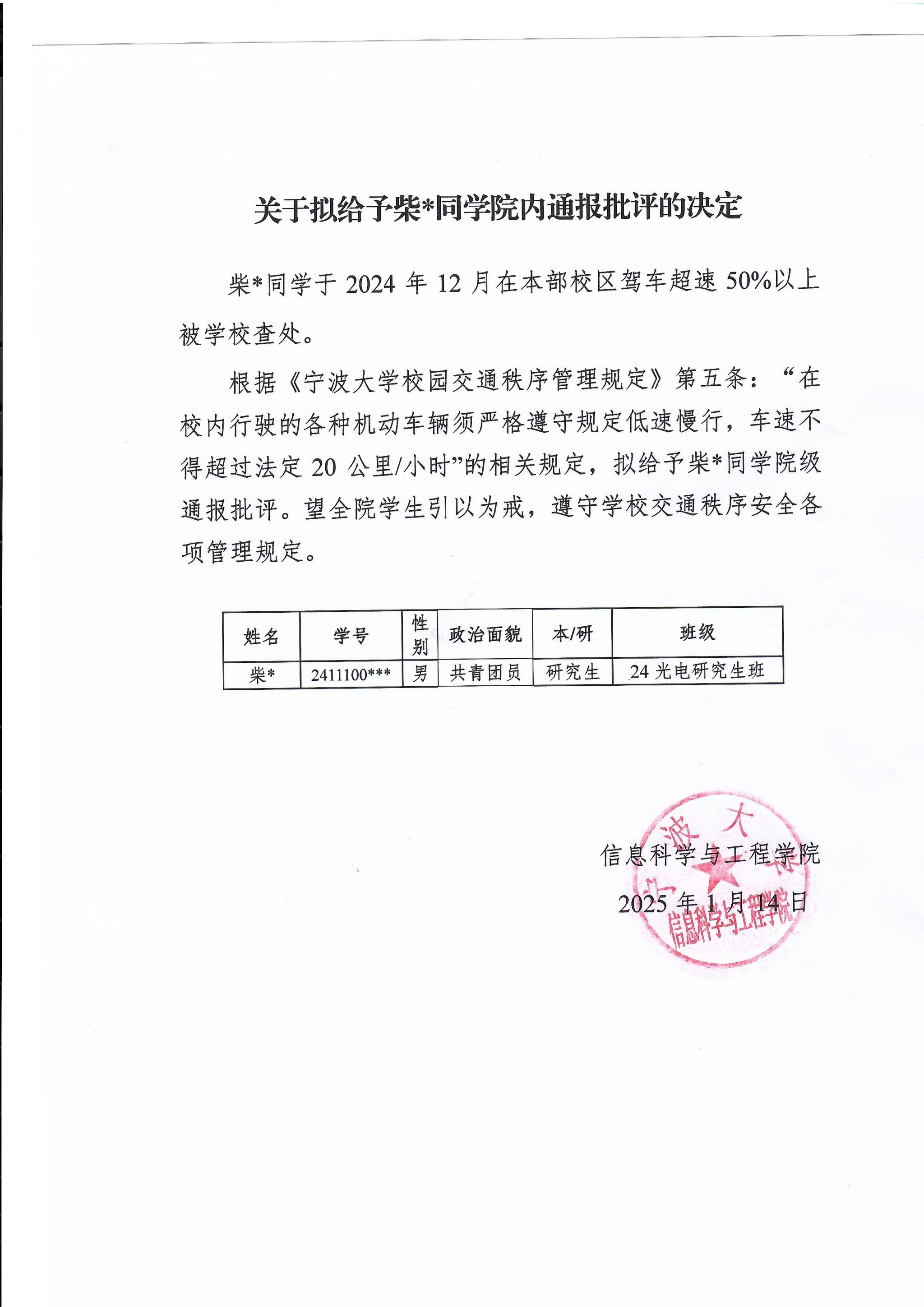 关于拟给予柴*同学院内通报批评的决定