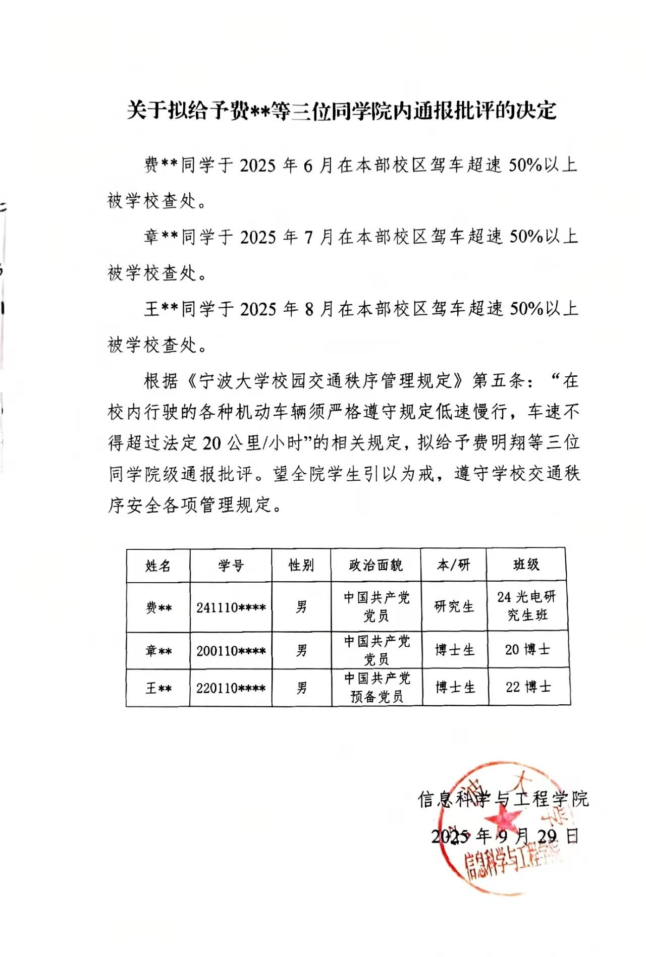 关于拟给予费**等三位同学院内通报批评的决定