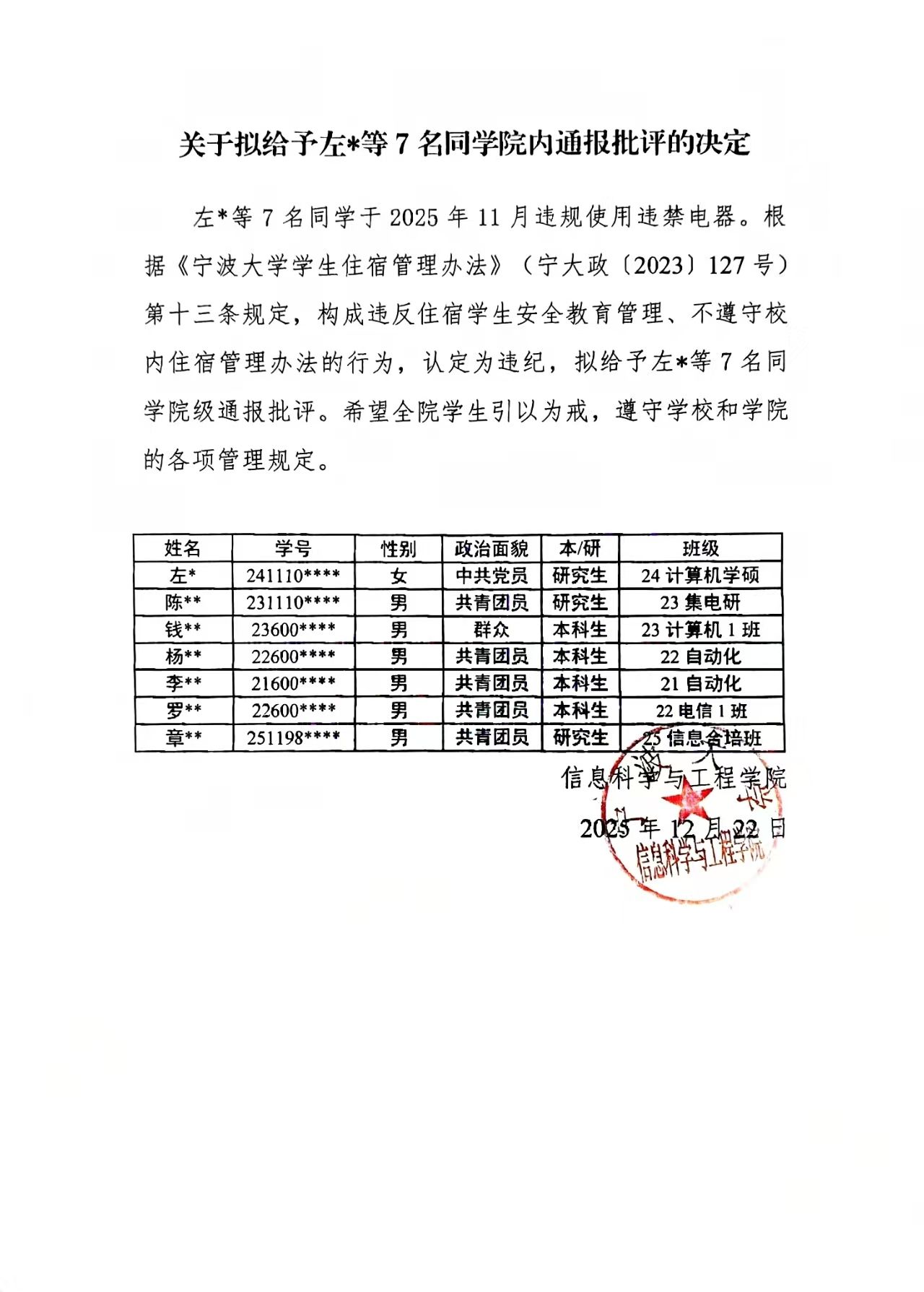 关于拟给予左*等7名同学院内通报批评的决定